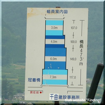 その“継ぎはぎ”は、具体的にどんな感じだったのでしょうか。当時撮影した看板の画像を掲載しましたので、そちらをご覧ください。橋全体が“道幅の異なる4つの橋の継ぎはぎ”だとご理解いただけると思います。