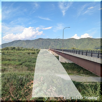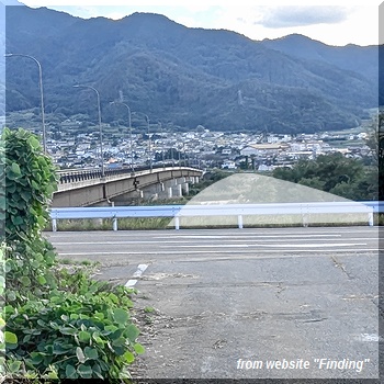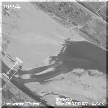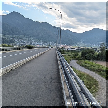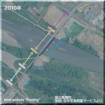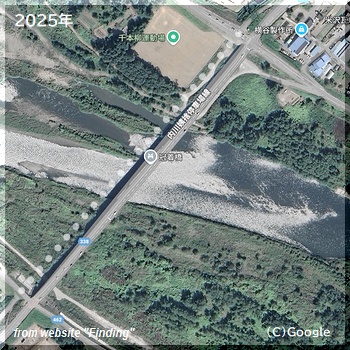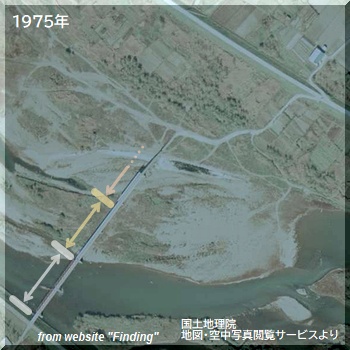 最初に向かったのは、2009年訪問で最初に紹介した画像の撮影箇所。一部残っていた旧橋への道路を背にし、旧橋があった川側を望みます。旧橋の架橋イメージを、今回撮影の画像に重ねてみました。